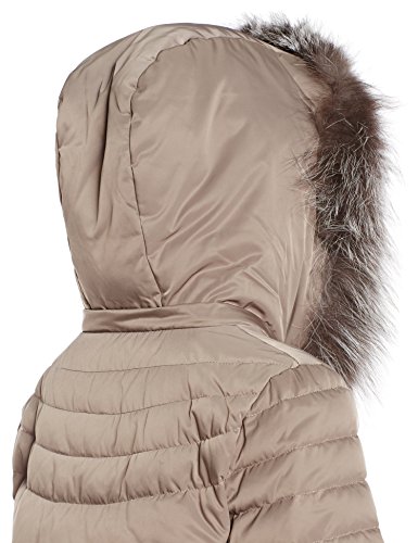 This coccoon shaped down coat is accented with a detachable genuine fur trimmed hood. This ultra-warm down has a flattering stand collar and chunky knit ribbed cuffs at the sleeve.Feature