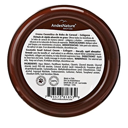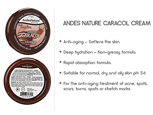Is your skin in need of a pick-me-up, or do you have acne, blemishes, scars, burns or stretch-marks? Then Andes Nature's Organic Baba De Caracol Snail Extract Cream provides a great feel, an even better look & has miraculous healing properties for your skin. This amazing miracle collagen repair cream has a special non-oily & rapid absorption formula. You can get all of the benefits that snail extract has to offer for the skin from our amazing cream. This 100% natural & organic snail extract collagen cream helps to buff out wrinkles in the face, neck & hands, heal acne, scars, burns, blemishes & stretch-marks leaving you feeling silky smooth with a radiant shine & soft-to-the-touch skin - The serum secreted by the Helix Aspersa Müller land snail from Chile has powerful antioxidants which protect them from an atmosphere full of oxygen radicals - Mixing highly effective moisturisers & nourishing ingredients along with antioxidants to the Snail's concentrated Extract & adding Collagen & Elastina we have formulated a cream intended to stimulate the Collagen's Synthesis & Elastin in a totally natural way; it penetrates up to the deepest layers of the skin, it reaffirms & tones your skin from the very first application - Your skin will feel smoother, with natural brightness & elasticity, visibly diminishing the appearance of fine lines & wrinkles caused by ageing, refining pores & helping to diminish spots, acne, scars or blemishes on the face & other areas of the body. Try it today 'Risk FREE' with our 30-Day Guarantee...Feature