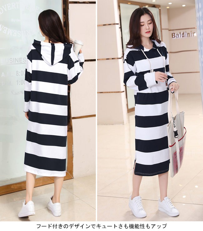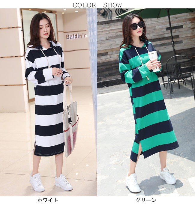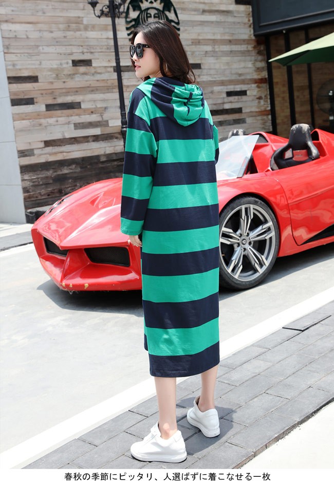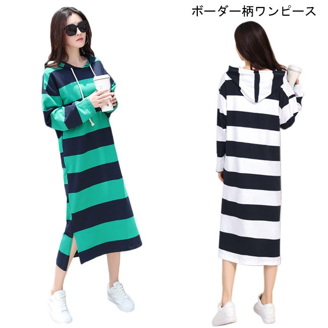 ロングワンピ レディース Tシャツワンピ フード ボーダー柄 ワンピース ゆったり 女性用 長袖ワンピース ロング 体型カバー 春秋物レディース用のワンピースが登場柔らかな綿混紡素材にゆったりとしたサイズ感でリラックスな着心地をもたらすフード付きのデザインでキュートさも機能性もアップロング丈のTシャツワンピ仕様でカジュアル感抜群、体型カバーも果たせる爽やかな配色と太めのボーダー柄もシンプルにオシャレ春秋の季節にピッタリ、人選ばずに着こなせる一枚カラー:ホワイト グリーン素材 綿混紡サイズ(cm) M L XLM 総丈110 肩幅54 バスト108L 総丈111 肩幅56 バスト112XL 総丈112 肩幅58 バスト116ご注意:※サイズは平置きサイズです。素人採寸ですので、若干の誤差がございます、ご了承ください。