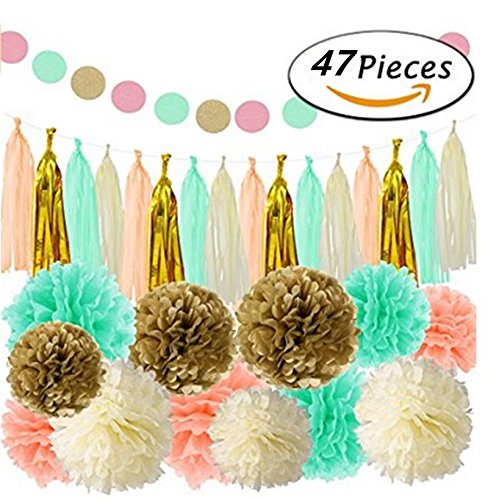 ASIBT 47Pcs Party Decoration Favors Tissue Paper Pom Pom, Tassel Garland Decor Set For Baby Showers, First Birthday Decorations, Gender Neutral Party, Summer & Spring Theme Parties (Mint Gold)