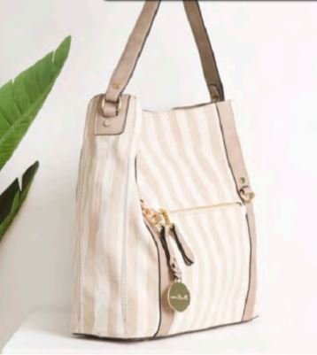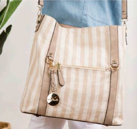 Large upright tote in pretty neutral textured canvas with vegan non leather trim and details. Great spring and summer bag that holds all your essentials.