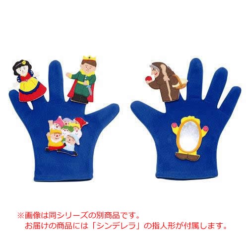 指人形専用のグローブ。面ファスナーが貼り付くようになっています。手にはめて動きをつけながらお話を展開できるから、よりダイナミックに人形劇が楽しめます。青色のグローブと指人形の「シンデレラ」をセットで。