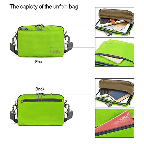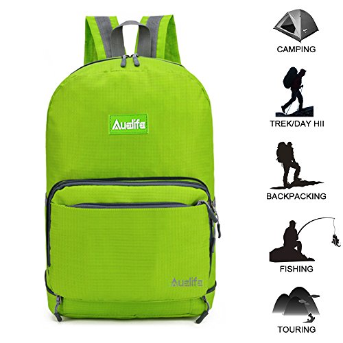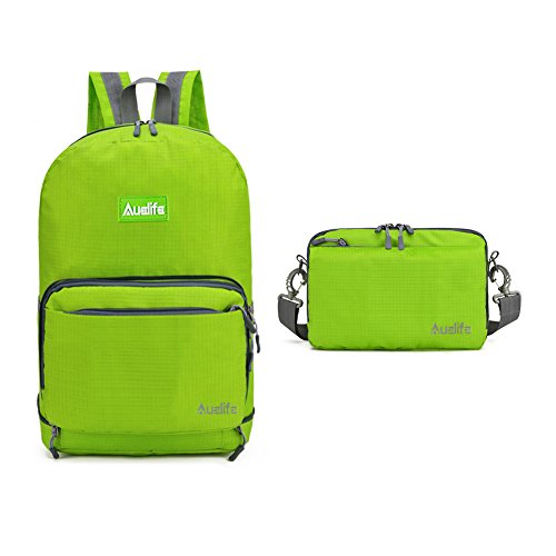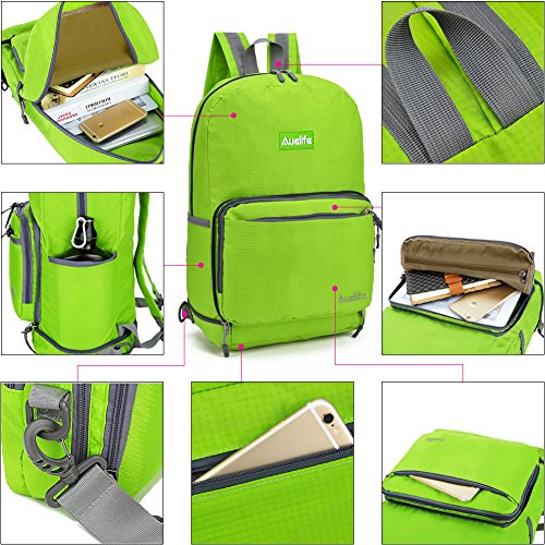 -. Feature : MULTIPURPOSE Daypack: Newest Style can be used as a travel packable backpack( 20L ) or shoulder bag( 7L ). Perfect for hiking,occasional travel, day trip, day hike, travel, camping, shopping, school, work camping and more / DURABLE AND WATER RESISTANT: Auelife Foldable Backpack made from highly rip and water resistant nylon fabric that provides strength and long-lasting performance with minimal weight / LIGHTWEIGHT AND COMFORTABLE: this lightweight backpack is perfect for day trips, vacation, travel, day hikes, school, camping and shopping. Experience makes the most comfortable wide breathable mesh shoulder straps. Easy to adjust the length and lock firmly. High quality SBS zipper goes smoothly / UNFOLD size: 16.5 x 11 x 7 inches (H x W x D). Unfold: total of 9 pockets.1 main Compartment(Exterior & Interior), 3 front zipped pockets (1 inside),2 Sports bottle holder,2 bottom zipped pockets. Folds size: 7x 11 x 2.2 inches (H x W x D). Fold:1 main compartment,3 Front zipped pockets (1 inside),2 back zipped pockets.. / WARRANTY: Our Promise-12month Warranty-Exchange, Return.