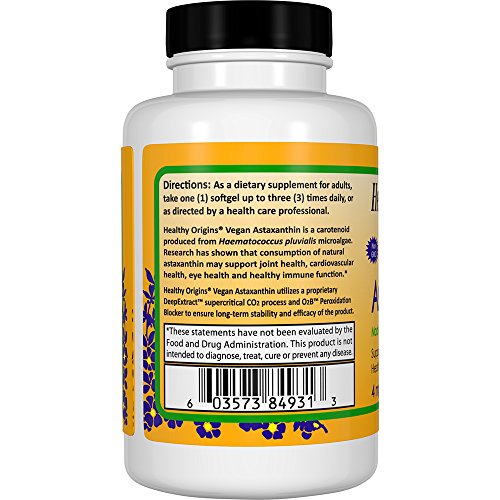 Healthy Origins Vegan Astaxanthin is a carotenoid produced from Haematococcus pluvialis microalgae. Research has shown that consumption of natural astaxanthin may support joint health, cardiovascular health, eye health and healthy immune function.Feature