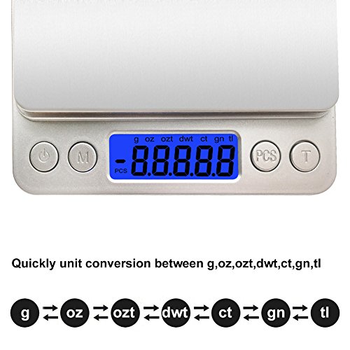 - ♣ MULTI-FUNCTION: Precision Tare Button calculates the net weight of your ingredients (automatically subtracts the weight of any bowl or container), conveniently convert measurement results between G, OZ, OZT, DWT, GN, and CT with the press of “M” button. The PCS function gives you an accurate count and the hold function will lock weight readings.
