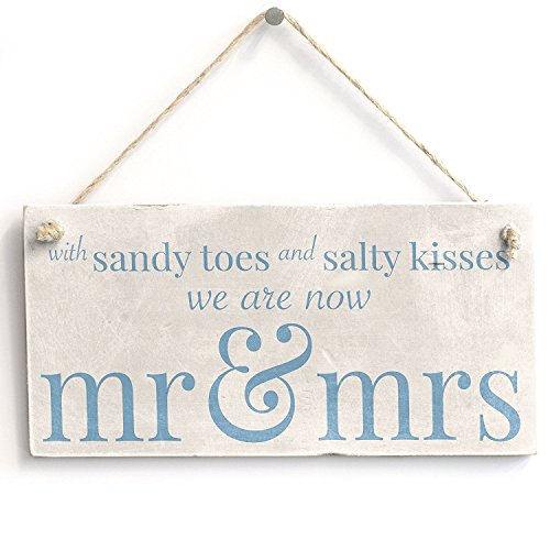 With Sandy Toes .. Mr & Mrs - Handmade Wooden Sign Beach Wedding / Married Sign Wooden Hanging Sign 4" X 8"
