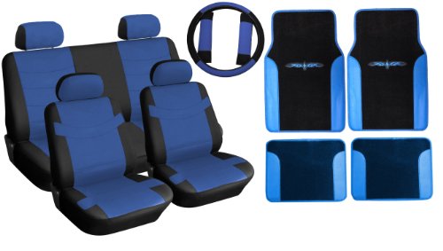 TWO TONE BLACK / BLUE SYNTHETIC LEATHER FRONT & REAR Seat Covers, Steering Wheel Cover, Seat Belt Pads & Vinyl Trim Mats COMPLETE INTERIOR SET & BONUS DETAILING WASH MITT