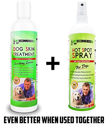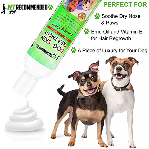 -. Binding : Misc. -. Brand : Vet Recommended -. EAN : 0646437797665 -. Feature : INSTANT SOOTHING RELIEF: Soothe your dogs damaged skin, relieve burning & itching from hot spots & is a perfect dog allergy treatment. Our dog skin treatment will calm the skin without using steroids. / INGREDIENTS TO PROMOTE HAIR GROWTH: With cooling ingredients such Vitamin E to calm the skin and Oil that accelerates hair growth for hair loss dogs; it will provide relief for dry skin for dogs. / DRY SKIN FOR DOGS: Provides a piece of heaven for hot spots for dogs, dry itchy skin dogs & dry noses that causes our pooches to be unhappy. Use cream to massage problems areas & give them serenity. / EASY TO USE: Simply apply to fingertips and gently massage the soothing dog skin treatment cream in the affected area. Can be used together with Vet Recommended hot spot treatment for dogs 8oz spray. / OUR SAFE COMMITMENT: Our packaging is made with recycled materials and eco-friendly. Safe for your pet, but also minimal environmental impact on our planet. We do not promote testing on animals. -. Label : Vet Recommended -. Manufacturer : Vet Recommended -. PackageQuantity : 1 -. ProductGroup : Pet Products -. ProductTypeName : PET_SUPPLIES -. Publisher : Vet Recommended -. Studio : Vet Recommended -. Title : Vet Recommended - Dog Dry Skin Treatment - Helps Dog Hair Loss Regrowth - Dog Dry Nose & Cracked Paws - Works with Hot Spot Treatment For Dogs & Helps with Dogs With Dry Skin - USA Made (8oz/240ml) -. UPC : 646437797665
