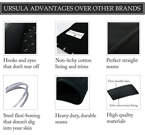 -. Binding : Misc. -. Brand : Ursula -. Department : womens -. Feature : Original Colombian design and technology, high quality manufacture and fair trade. Don't be fooled by cheap Chinese imitations. Authentic Ursula fajas are sold by Five Big Stars only. NOTE improved images displaying with new models from our April 2016 photo shoot. / All sizes have been confirmed to fit. BUYER NEEDS TO USE TAPE MEASURE TO CONFIRM HER ACCURATE WAIST SIZE BEFORE ORDERING to prevent ordering wrong size. DO NOT GO BY YOUR CLOTHES SIZE, HEIGHT OR WEIGHT. / STEEL FLEXIBLE BONING (2 at front and 2 at back) for extra support prevents garment from rolling up or down and bends with your body to prevent poking into skin. NO-SLIP INNER COTTON LINING; latex does not touch skin. / IMPROVES FIGURE by instantly controlling bulges and slimming body. Compression trains waist to smaller size and latex BOOSTS THERMAL ACTIVITY during exercise, STIMULATING FAT LOSS. / 2 torso height options for standard (11" high) or long (13.75" high) coverage. Delicate seams and small hooks and eyes closure make it a discreet garment for wearing under clothes. -. Model : WC01 -. PackageQuantity : 1 -. ProductGroup : Sports -. ProductTypeName : SPORTING_GOODS -. Title : Ursula Waist Trainer for Weight Loss Latex Workout Cincher Hourglass Corset XXS-4XL
