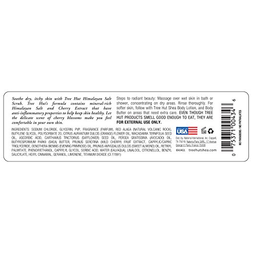 Himalayan Sea Salt grains contain 84 minerals and trace elements to help soothe inflamed skin while removing dead skin cells. It is infused with Wild Cherry Fruit Extract for skin hydration, protection and anti-aging. This fantastic product is made with certified Organic Shea Butter for skin repairing and moisturizing, anti-aging and promoting elasticity. Tree Hut's Himalayan Salt Scrub is formulated with Red Clay for skin conditioning. Enjoy the delicate scent of cherry blossoms.Feature