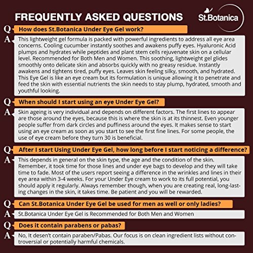 HELPS REDUCE DARK CIRCLES & PUFFINESS: This lightweight gel formula is packed with powerful ingredients to address all eye area concerns. Cooling cucumber instantly soothes and awakens puffy eyes. Hyaluronic Acid plumps and hydrates while peptides and plant stem cells rejuvenate skin on a cellular level. Recommended for Both Men and Women