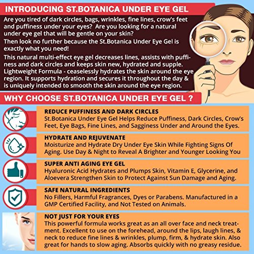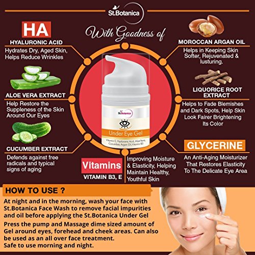 It is also Useful for the entire face. Can be applied all over the face for an enhanced glow and a more radiant looking face. When applying St.Botanica Under Eye Gel around your eye, notice how refreshing the gel is for all skin types yet effective with Hyaluronic acid to get incredible eye therapy results. Wrinkles lessen quickly, puffiness improves drastically, and dark circles lighten giving way to radiant, glowing, healthy eyes that pop.