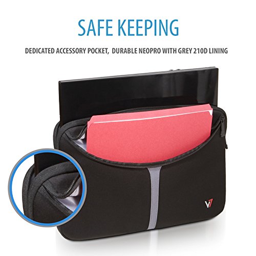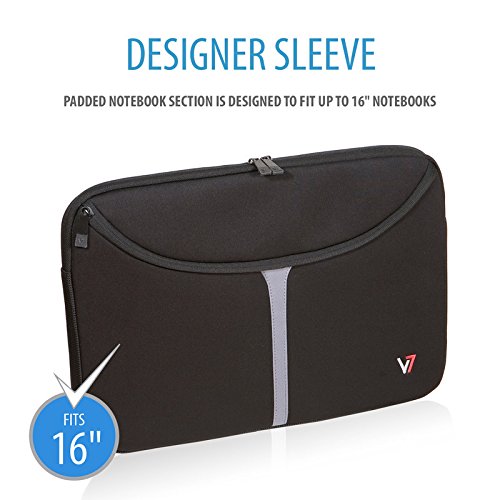 The V7 Professional Laptop Sleeve uses a form-fitting neopro material which stretches to accommodate most laptops with a 16-inch display. With a cushioned internal lining and durable outer guard, the laptop sleeve provides the ultimate protection for your computer. The slim line design shields your laptop on its own or in your favorite bag. Dedicated zippered accessory pocket provides a convenient place to carry your power adapter, DVDs, cables and accessories.