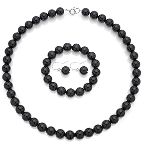 -. Title : Sterling Silver 10mm Simulated Black Onyx Necklace 18" , 7" Strech Bracelet and Wire Dangle Earrings