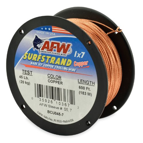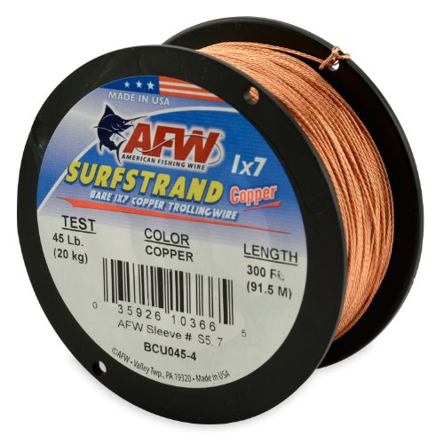 ReleaseDate : 2011-03-23 Studio : American Fishing Wire Publisher : American Fishing Wire Binding : Sports Product Description Surfstrand Copper Trolling wire is bare, 1x7 stranded copper wire that has 13% greater density than stainless steel. This line sinks more rapidly than stainless steel, and allows you to troll deeper with less line in the water. The 1x7 strand construction gives this line good flexibility and kink resistance. Many anglers report increased strike rates with the use of copper terminal tackle - believing that the positive ions in copper help to attract fish. 0