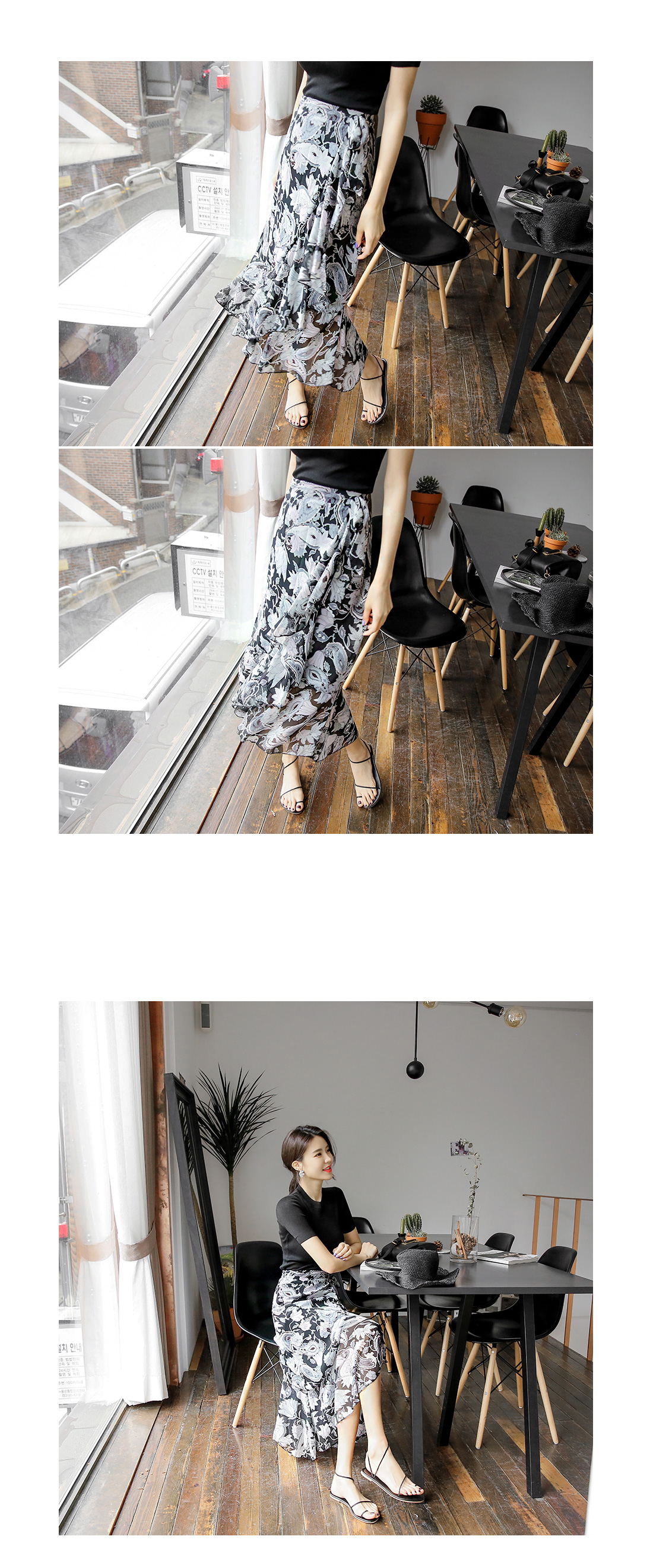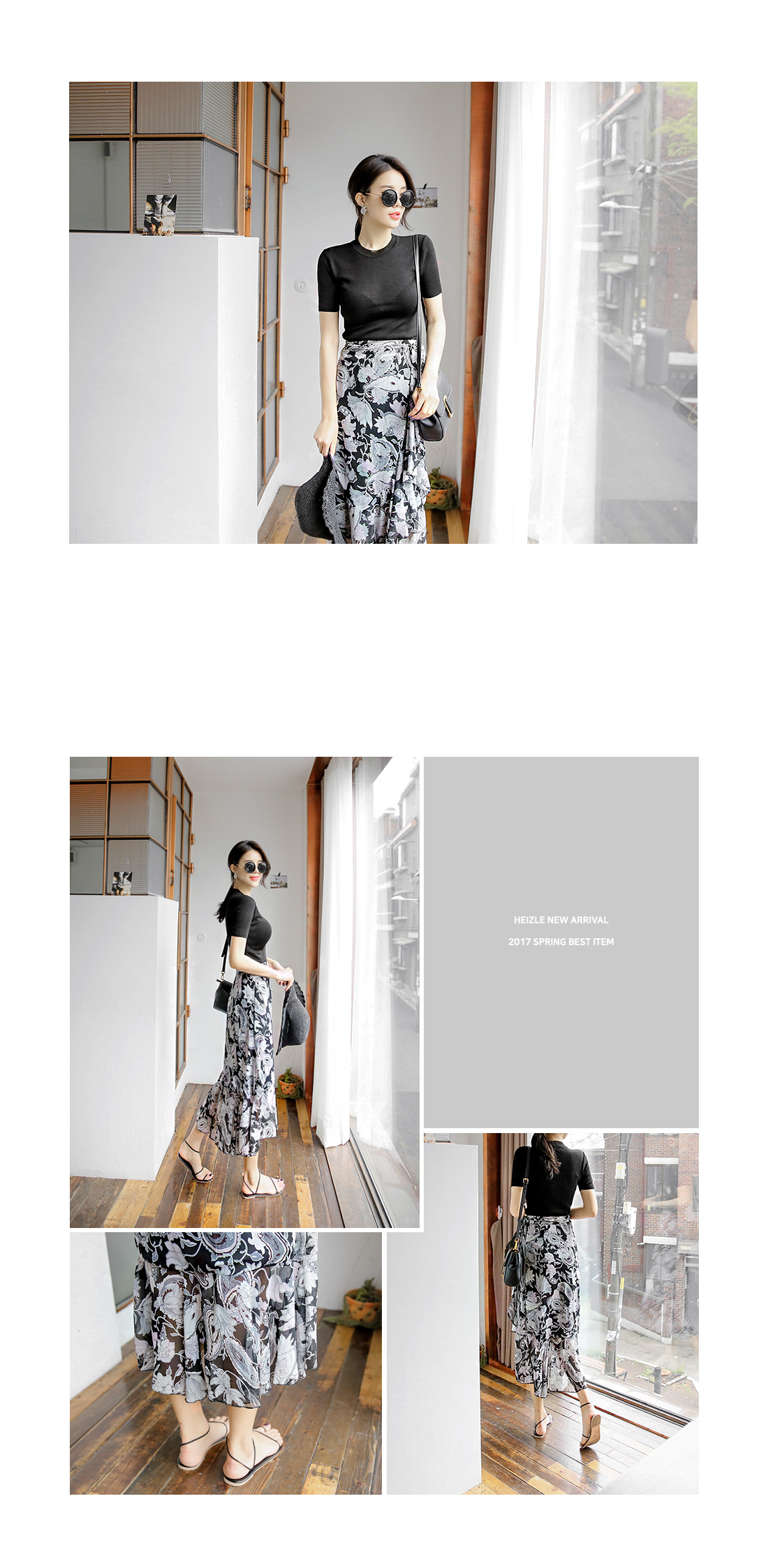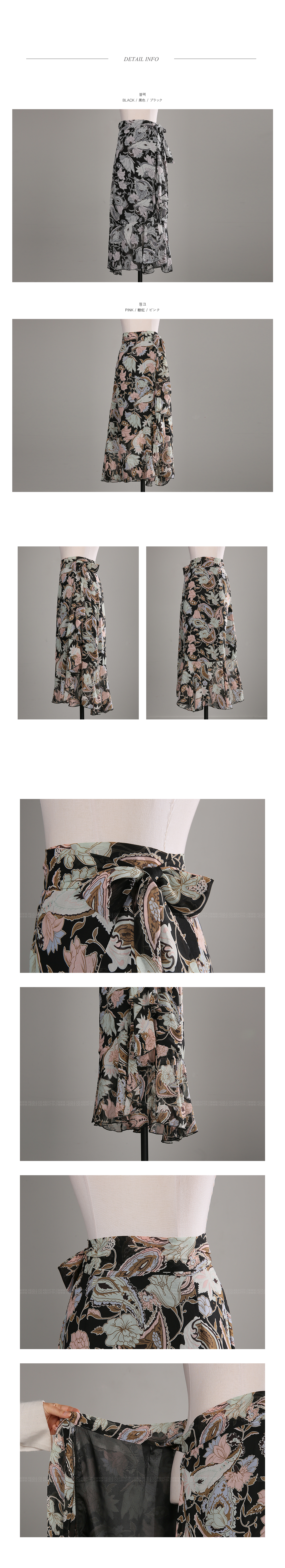 고급스러운 플라워 패턴이 돋보이는 스커트 아이템을 소개해드릴께요~^^ 랩스커트 디자인으로 페미닌룩을 연출하기에도 알맞은 스커트랍니다~ 프릴 디테일이 가미된 쉬폰소재로 걸을 때마다 살랑거리는 고급스러운 분위기를 연출해드리는 아이템이예요~ 적당한 기장감과 쉬폰소재로 여름까지 부담없이 즐길 수 있는 스커트 아이템을 적극 추천해드려요~