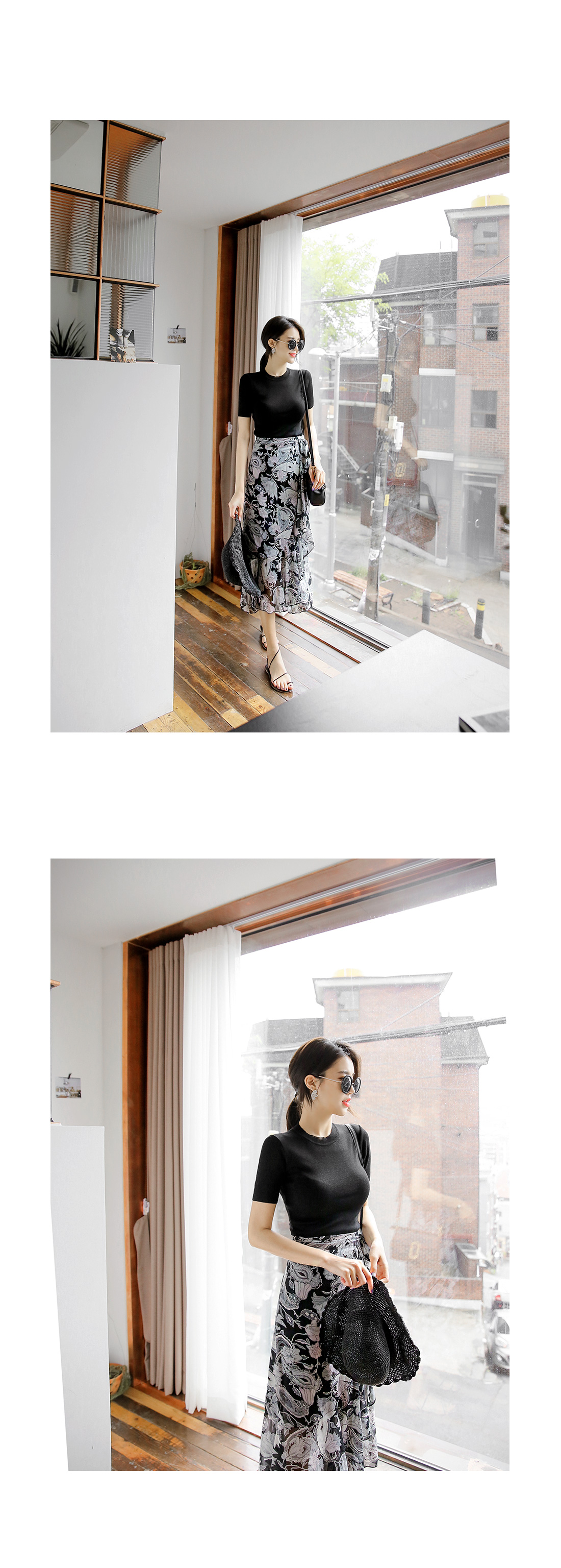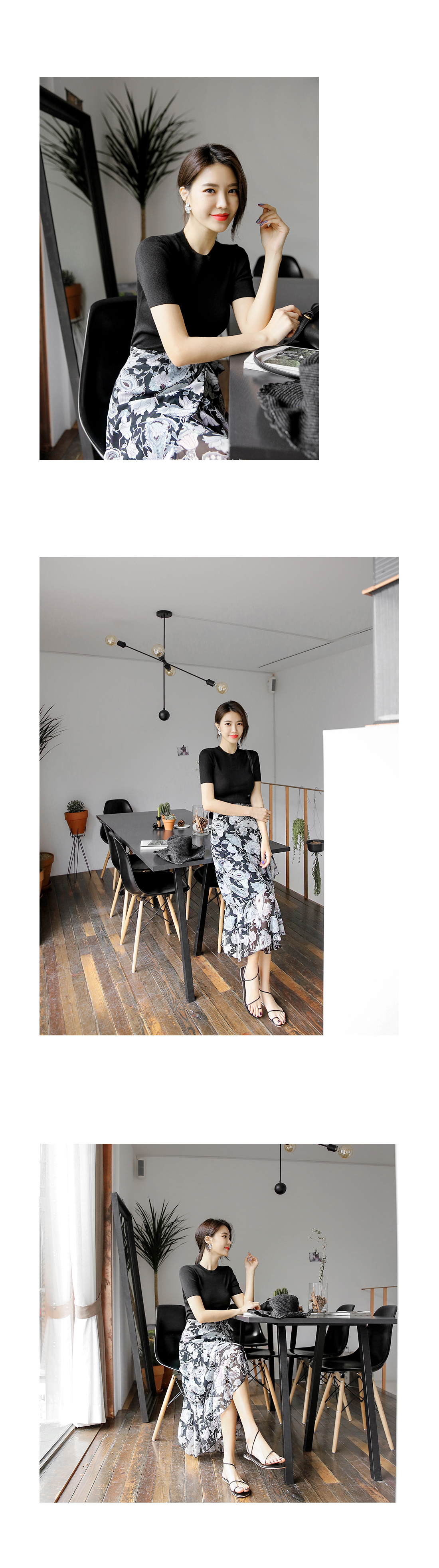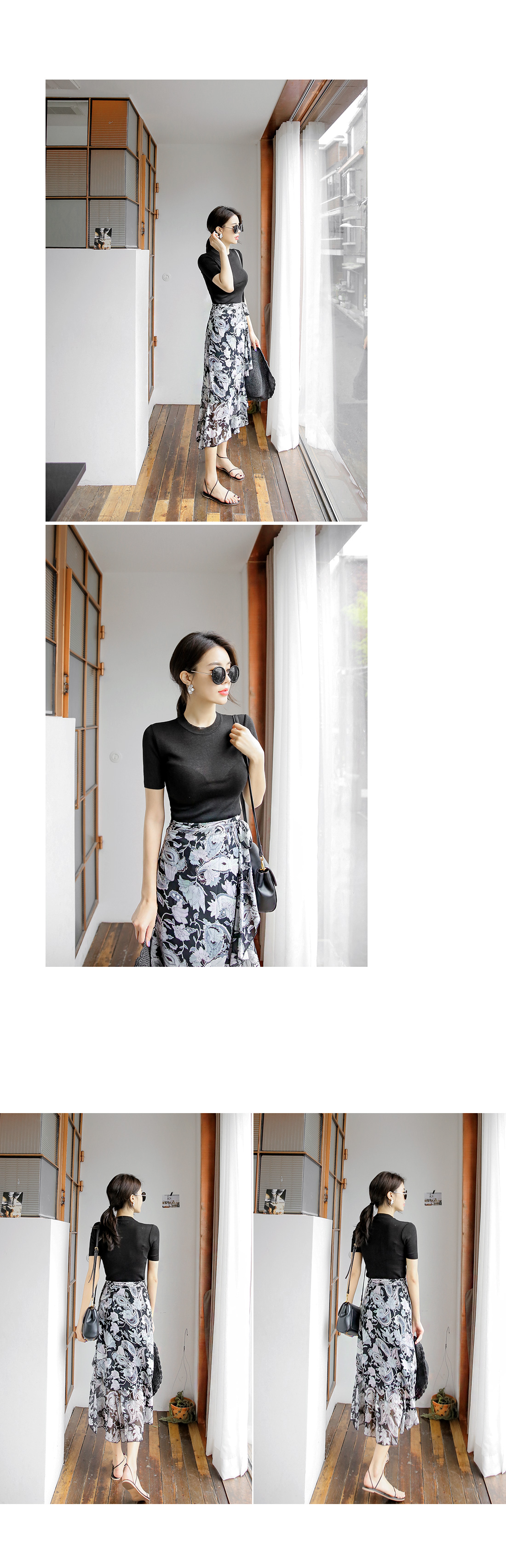 고급스러운 플라워 패턴이 돋보이는 스커트 아이템을 소개해드릴께요~^^ 랩스커트 디자인으로 페미닌룩을 연출하기에도 알맞은 스커트랍니다~ 프릴 디테일이 가미된 쉬폰소재로 걸을 때마다 살랑거리는 고급스러운 분위기를 연출해드리는 아이템이예요~ 적당한 기장감과 쉬폰소재로 여름까지 부담없이 즐길 수 있는 스커트 아이템을 적극 추천해드려요~
