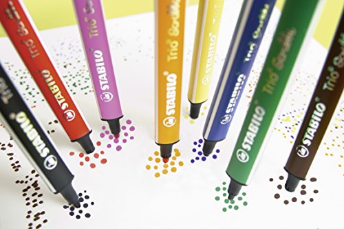 -. Binding : Accessory -. Brand : Stabilo -. Color : Assorted Colours -. EAN : 4006381340212 -. Feature : Almost indestructible children's felt tip thanks to its sP.R.Ing loaded thick tip; / The triangular design helps children get a secure, ergonomic grip; / Super washable ink which is easy to move from both hands and clothing; / Line width of nib is 1.5mm to 2.0mm; / Free 3D colouring App at stabilo.com/3dcolors; -. Label : STABILO International GmbH -. Manufacturer : STABILO International GmbH -. Model : 368/40-1 -. MPN : 368/40-1 -. PackageQuantity : 1 -. PartNumber : 368/40-1 -. ProductGroup : Office Product -. ProductTypeName : OFFICE_PRODUCTS -. Publisher : STABILO International GmbH -. Size : Pack of 40 -. Studio : STABILO International GmbH -. Title : STABILO Trio Scribbi Triangular Felt Tip Pen - Assorted Colours (Pack Of 40)