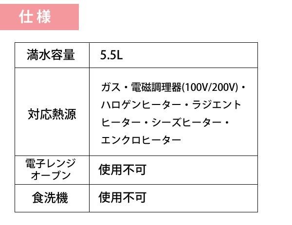 | 仕様 | 満水容量:5.5L 対応熱源:ガス・電磁調理器(100V/200V)・ハロゲンヒーター・ラジエントヒーター・シーズヒーター・エンクロヒーター 電子レンジ・オーブン:使用不可 食洗機:使用不可 |