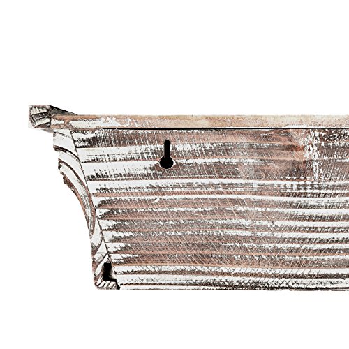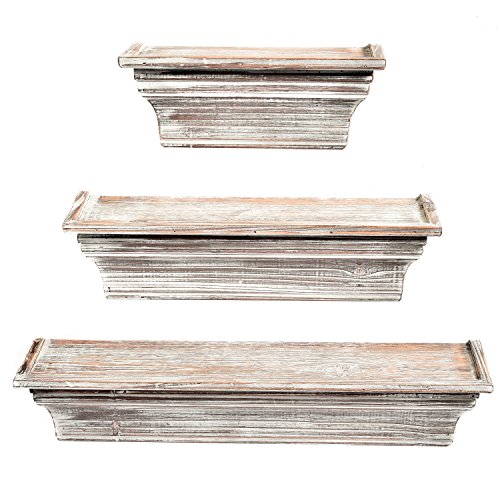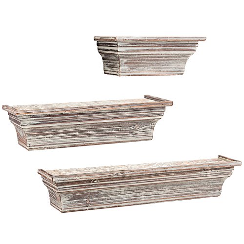 This set of 3 wall mounting shelves is an ideal way to bring rustic style display space to your home. At roughly 11.25 inches wide, the smallest shelf is perfect for displaying decorative plants, photos or other decor. The other 2 larger shelves, measuring in at 18.75 and 24.25 inches wide, can be used to store and display larger items like books and kitchen supplies. The shelves can be mounted flush against a wall using the 2 pre-drilled slots on the back of each shelf (mounting hardware not included). Mount all 3 of these shelves on the same wall to form a unique pyramid shaped display rack, or use them on different walls throughout your home. Wherever they are, the torched wood surfaces and extra display space will be a valuable addition to your walls.**Official MyGift® product.**