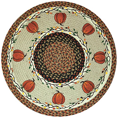 Product Description Hand stenciled Harvest Pumpkin design by Susan Burd. 27 Inch Round. Made from 100% Natural jute fiber that can be spot cleaned with mild soap and water. 0