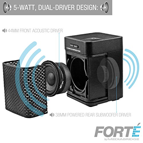 Powerful Dual Driver Design: 44mm acoustic driver with rear firing 38mm powered subwoofer combine for 5 Watts of full bodied power with deep bass that belies small, portable bluetooth speakers.