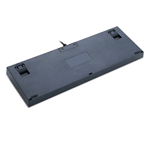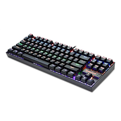 -. Feature : 1- Custom mechanical switches (Cherry Green equivalent) for ultimate gaming performance / 1- 6-colour Rainbow LED backlight adjustable lighting and double-shot injection molded keycaps for crystal clear backlighting / Metal and ABS construction, mechanical keys, and gold plated USB connector stand up to hardcore gaming. / Custom mechanical switches designed for longevity, responsiveness, and durability. Mechanical keys with medium resistance, audible click sound, and tactile feedback / 87 standard conflict free keys, 12 multimedia keys, and splash-proof design