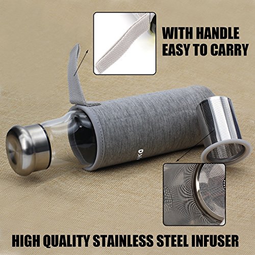 A bottle to be noticed. If your other cups and mugs could admire, they would.Imagine the bottle neck turns once this smooth, curved, finely designed bottle hits the cabinet.Instead of the mugs expression turning from sad to happy when hot liquid entered, it would smile when you stored the bottle away and frowned every time it left to be used.Capacitive with infuser 13.5 oz and without infuser 13.1 oz.Size with infuser 9.84 in. X 2.55 in. & without 10.23 in. x 2.55 in.Feature:**Leak proof - Designed with silicone rings to ensure no spillage.**Easy to clean - glass is dishwasher safe but we recommend hand washing. Parts can be easily separated for cleaning.**Nylon cover for added protection with a wonderful convenient loop handle for easy transporting.**FDA-approved food-grade materials from top to bottom. **Made with high quality, top notch, and transparent borosilicate glass. Kiss toxins goodbye.**BPA, Lead, and Phthalates Free.**Shatter resistant -Although extremely durable, if accidentally broken, shattering is not a concern. Avoid your little one stepping a small piece of glass from sweeping up days ago.So which should you choose??Get with or without infuser. The silicone is attached to the infuser chamber;therefore, you must leave infuser in the bottle to avoid leakage even when not infusing or remove silicone ring from chamber and place inside of the bottom lid.So, get both! Take it to the gym, yoga class, school, work, and keep on the side of the bed. Get it today!Feature