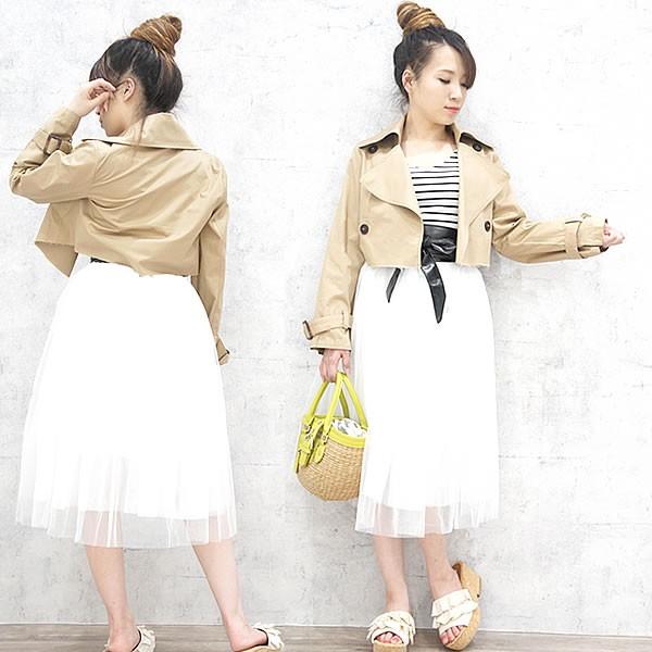 裾部分が切りっぱなしになっているショート丈トレンチジャケットです。 チュールスカートと合わせてガーリーコーデしたり。 スキニーパンツと合わせてカッコよくコーデしたり。 色々なコーディネートが楽しめるトレンチジャケットです。 サイズ 丈:38cm 肩幅:38cm 身幅:46cm 袖丈:56cm 平置き採寸 カラー ベージュ 素材 綿 100% ストレッチ:なし 透け感:なし MADE IN CHINA モデル身長 153cm バッグ・靴:私物 |