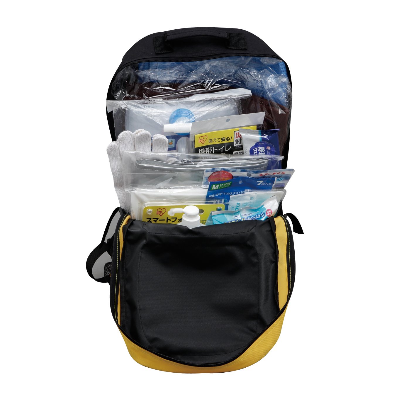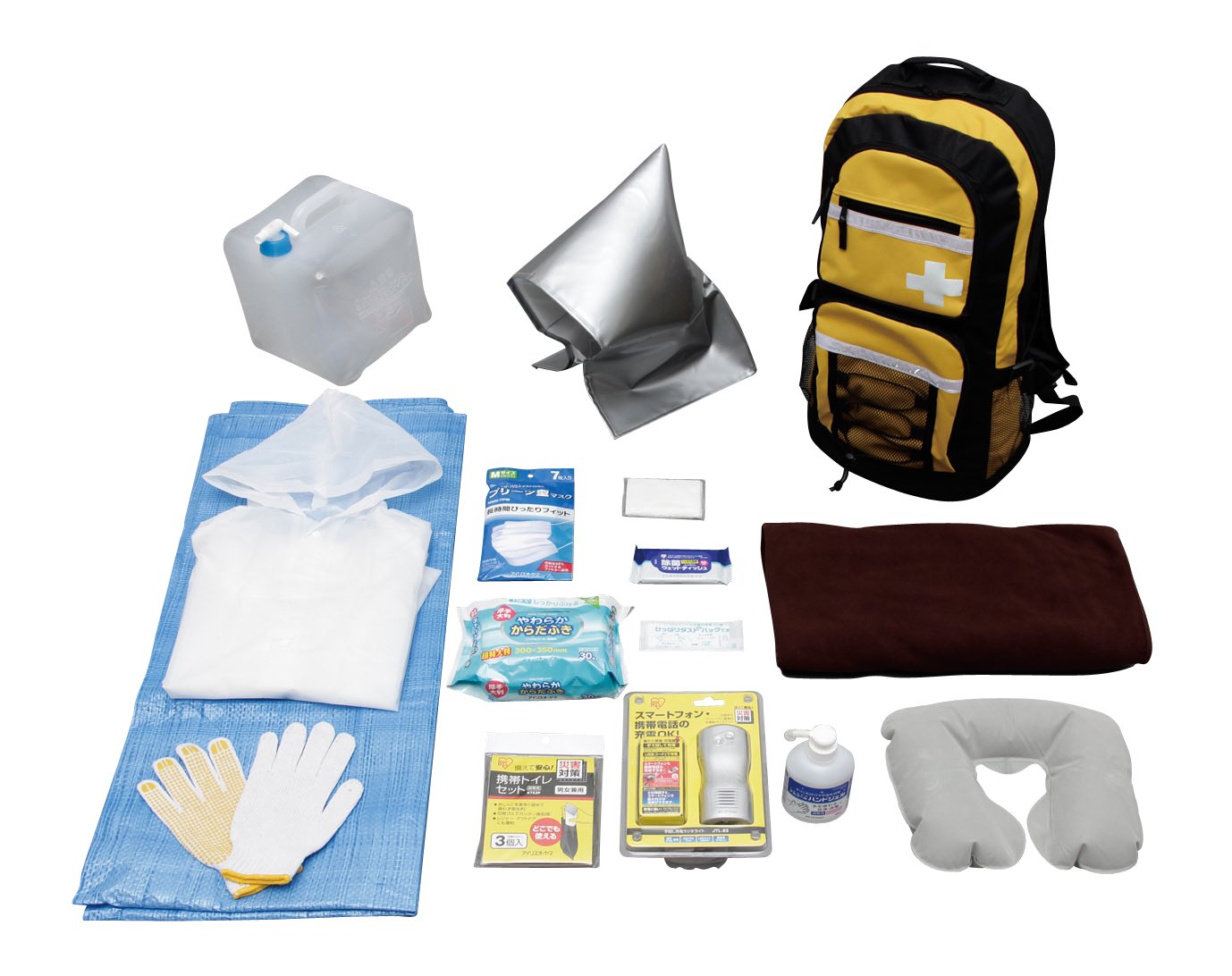 Alcohol hand gel, tissue (8 sheets), blanket, air pillow, water tank (10 L), garbage bag, rucksack