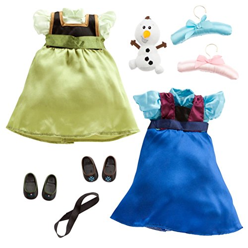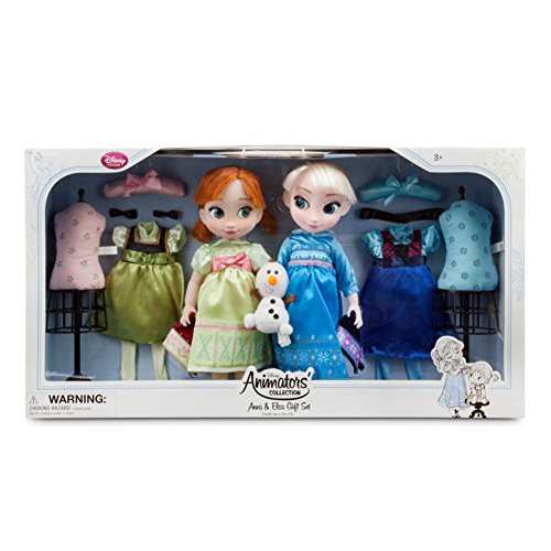 - Feature : Anna and Elsa dolls each come with 2 detailed satin outfits,floral filigree screen art patterns,leggings and socks / Molded shoes with matching decoration,rooted, styled hair,satin hair ribbons / 2 padded dress forms,2 satin-covered hangers.includes fuzzy plush Olaf with embroidered details / Comes in collector's display box featuring animators' character sketches and top carry handle,part of the Disney Animators' Collection / Ages 3+,plastic / polyester,dolls 16'' H