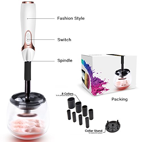 - EASY TO USE – With high speed spinning, this rotating tool cleans all your brushes thoroughly and completely within seconds; No need to wait hours for your brushes to dry; Fits all your makeup brushes with 8 different sized holders to choose from!