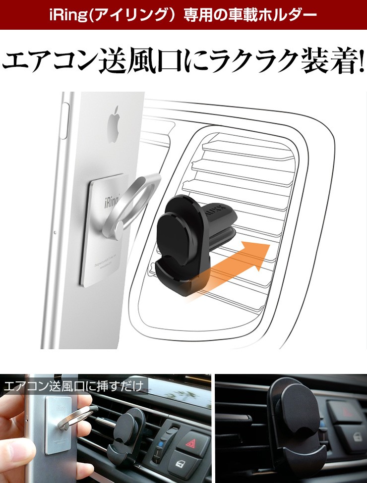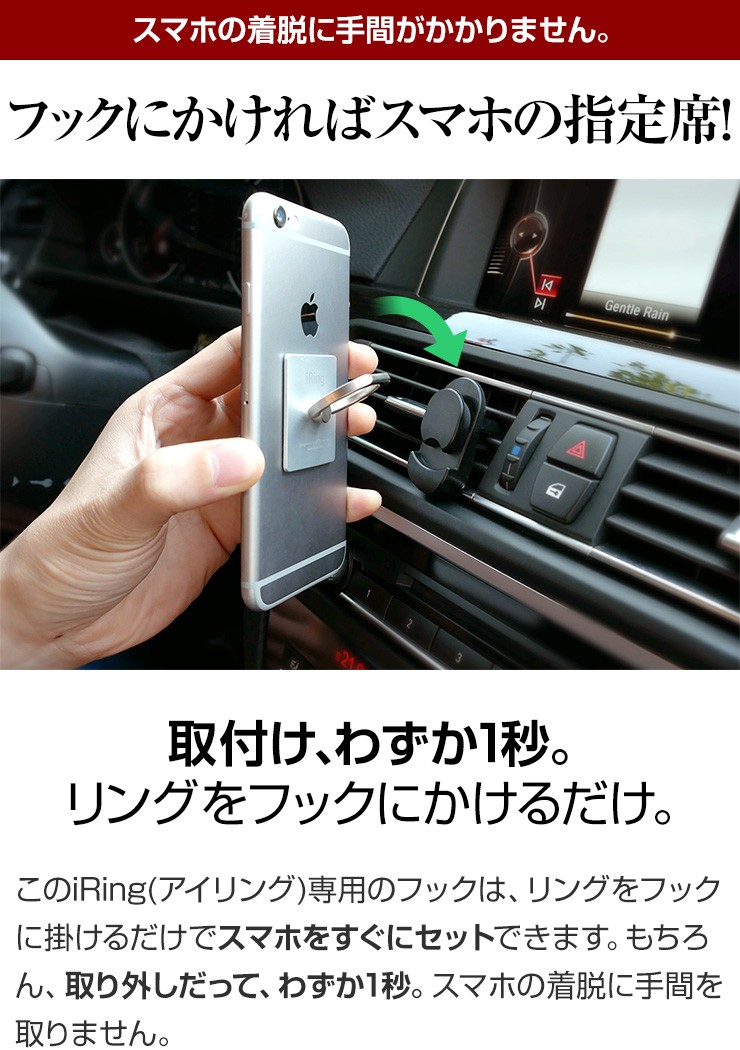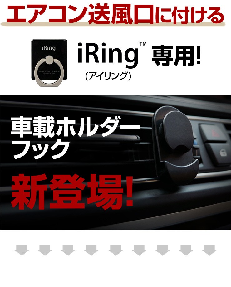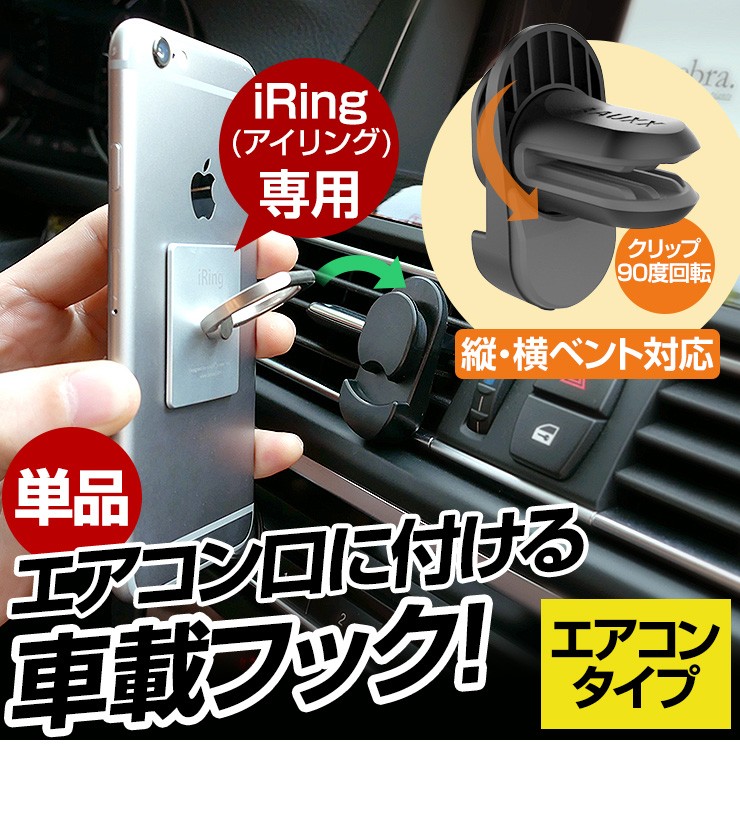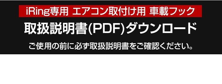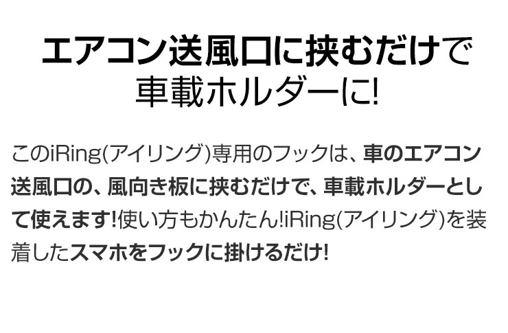 | 注意事項 | ※iRing Hook Air VentはiRing及びiRing Pocket専用です。 iRing並びにiRing Pocket以外でご利用いただいた場合の保証は致しかねます。 ※エアコン送風口のフィン(風向き板)の厚みは2mm以上です。 ※本体のクリップは完全に奥まで差し込んでください。 ※エアコン送風口の奥行きをご購入前に必ずご確認ください。 ※取付時などに、過度な力を加えないでください。破損の原因となります。 |