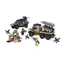 -. Feature : Mega Bloks True Heroes missile battle set with heavily armed armoured car, designed with radar stopping technology and dualgun mount capable of a duo of machine gun and light cannon fire / Large 4x4 all terrain truck is designed with Mega Bloks camo effect blocks to blend in with its surroundings, and carries a multidirectional missile launcher with four long range missiles