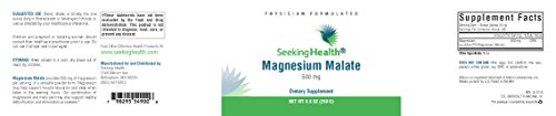 -. Binding : Health and Beauty -. Brand : Seeking Health -. EAN : 0798295549006 -. Feature : IMPORTANT: Magnesium Malate Powder is manufactured for and sold exclusively by Seeking Health. We DO NOT recommend purchasing this product from any supplier other than Seeking Health on Amazon.com. / Magnesium Malate Powder by Seeking Health provides 500 mg of Magnesium (as dimagnesium malate) per serving. / The mineral magnesium along with malic acid found naturally in fruit and added to food products to produce a sour or tart flavor combine to produce many health benefits related to energy production.* / Does not contain: Wheat, gluten, yeast, soy, GMO, animal or dairy products, artificial colors or artificial preservatives. / Physician formulated. -. Label : Seeking Health -. Manufacturer : Seeking Health -. MPN : MAGN-500MG-POW -. PartNumber : MAGN-500MG-POW -. ProductGroup : Health and Beauty -. ProductTypeName : HEALTH_PERSONAL_CARE -. Publisher : Seeking Health -. Studio : Seeking Health -. Title : Magnesium Malate Powder | Provides 500 mg of Magnesium Malate as Dimagnesium Malate Per Serving | Non-GMO | Physician Formulated | Seeking Health -. UPC : 798295549006