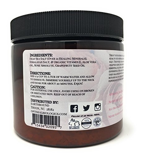 - ORGANIC ESSENTIAL OILS: Earthbound utilizes only the finest precious organic essential oils which are targeted to work with your hand crafted bath soak. Our premium organic essential oils are infused into our Pure Dead Sea and Himalayan Salts so that you will experience only the highest quality therapeutic bath possible. Bring home the healing waters of the Dead Sea with the added benefits of ancient Himalayan mineral rich salts and the wonderful aromatic botanicals into your own bath!