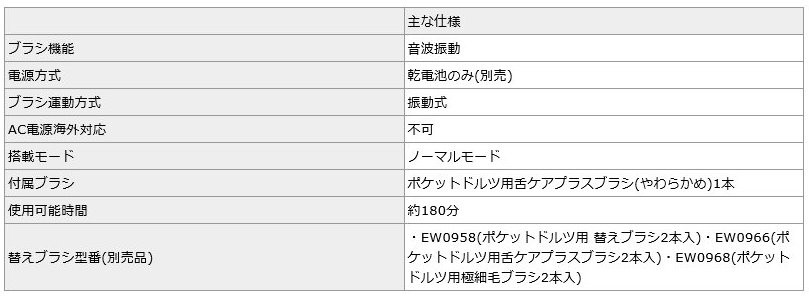 ・毎分約16,000ブラシストロークの音波振動・舌表面の汚れもやさしく除去する「舌ブラシ」・男性にも扱いやすいロングサイズ毎分約16.000ブラシストロークの音波振動1で手磨きよりもツルツルの歯に毎分約16.000ブラシストロークの微細な音波振動により、同じ磨き時間でも、手磨きよりもツルツルの歯に。時間のないお昼休みにぴったりです。舌表面の汚れもやさしく除去する「舌ブラシ」 ブラシ背面に舌ブラシがついており、舌表面の汚れをやさしく除去可能。外出先でもすばやく手軽にケアできます。男性にも扱いやすいロングサイズ他のポケットドルツより1.2cm長いので、手の大きな男性の携帯用にぴったりです。