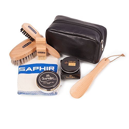 Product DescriptionA luxury shoe care kit from Saphir consists of 1 oval horse hair brush in natural, 1 Suede brush, 1 pommadier brush natural, 1 Shoe cream in Black, 1 neutral tin of wax, 1 19cm wooden shoe horn, 1 polishing cloth and 1 leather bag.0