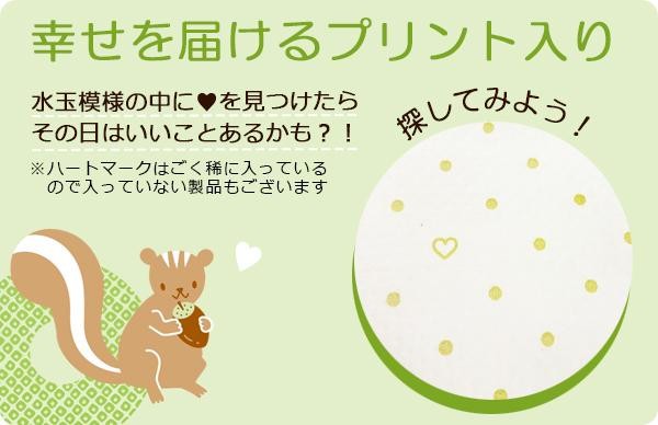 | 仕様 | 紙芯:有 エンボス加工:有 ミシン目:有 香料:無 カラー:白地に緑1色の水玉柄プリント ワンタッチホルダー対応 |