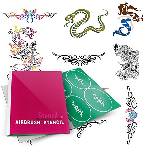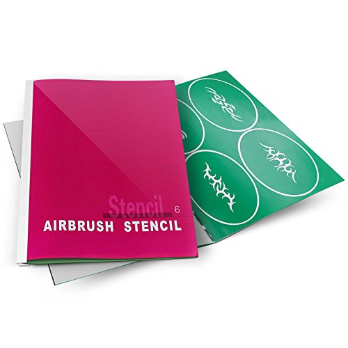 Studio : PointZero Airbrush Publisher : PointZero Airbrush Binding : Misc. Product Description Professional-grade, easy-to-use stencils designed for airbrushing temporary tattoos. Organized in a book containing fourteen 16" x 11.25" pages (13 pages each have a single design, 1 page has 2 designs), you will receive a total of 15 different individual patterns as illustrated above. Designs are reverse cut out of the stencil material, so when they are painted over, only the pattern will remain; the overspray will be masked by the stencil. This makes it fast and easy to produce consistent, excellent results. To use, clean the area where the tattoo is to be applied. Peel a stencil from the book and apply to the skin; the self-adhesive backing holds it in place. Airbrush over the stencil and remove. These durable stencils are easily cleaned with alcohol and can be used repeatedly. When dry, return it to the book until needed again. The binding of the stencil book can be opened and re-closed, allowing you to remove or re-order pages as needed. There are 13 stencils each measuring 13.75" x 9" , and 2 stencils measuring 9" x 6" , however the actual size of each pattern varies by design. Model: Stencil Book 6 0