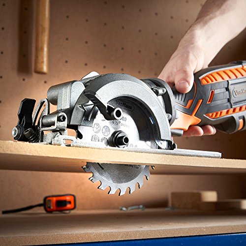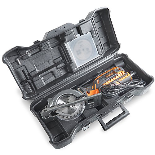COMPACT, LIGHTWEIGHT and POWERFUL: 5.8-amp electric motor – delivers a no load speed of 3,500 rpm – easily cuts through wood and MDF. Includes 2 X 2 4T Tungsten Carbide Tipped Blade 4-1/2 in diameter. Arbour Size: 3/8in