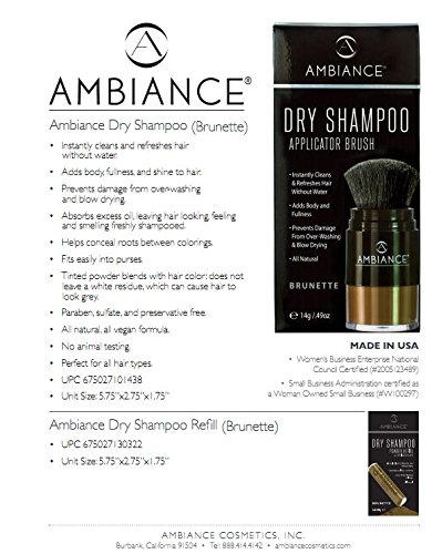 Many dry shampoos are messy and leave behind a white powder residue that makes your hair look gray. The good news is you don't need to settle for a dry shampoo that doesn't meet your needs. Ambiance Dry Shampoo is tinted to complement your hair color so you can freshen up greasy, oily locks at home and on the go, without the mess. The easy to use applicator brush applies powder in just seconds, instantly leaving your hair looking, feeling, and smelling clean and freshly shampooed. Ambiance Dry Shampoo is the perfect remedy for no-wash days and on the go touch ups, making every day a good hair day!