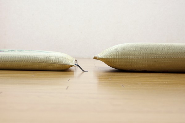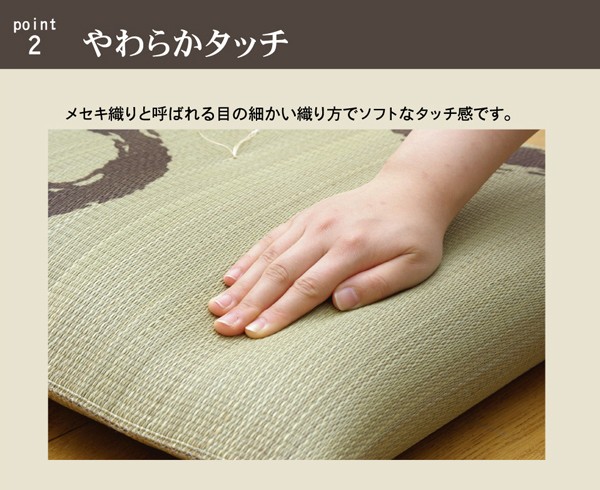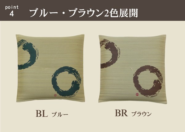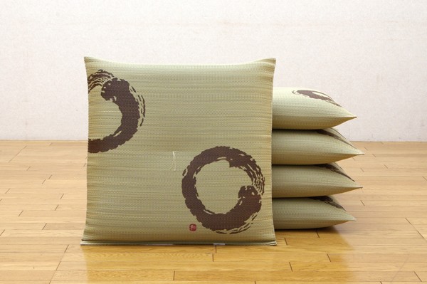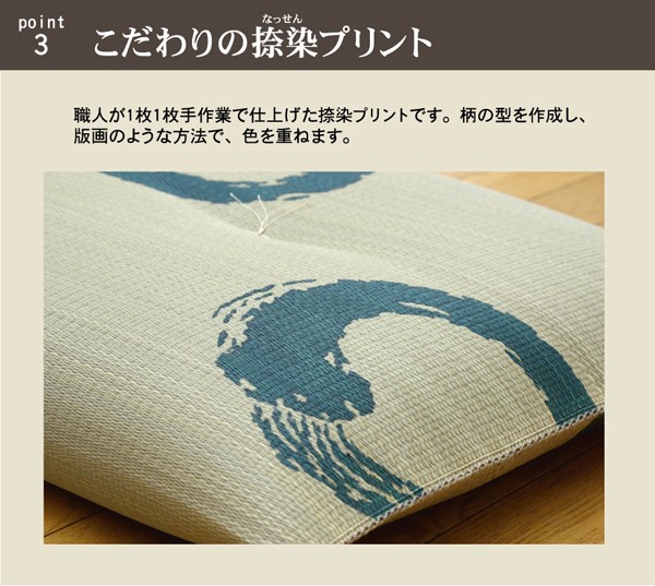 職人が1枚1枚手作業で捺染プリントを施したイ草座布団です。中材にはメーカー比1.5倍の量のわたを使用しています。ふっくらフカフカとしたボリューム感をお楽しみ下さい。生地にはメセキ織りと呼ばれる織りを採用し、柔らかくさらっとした肌触りに仕上げました。国産(九州産)のい草を使用しています。一本一本が太く、表皮が厚く繊維がキメ細かいので弾力性があり、耐久性に優れています。い草には空気の自然浄化作用、湿度の調節作用などがあります。また汚れにくく、使用するうちに黄金色に変化し味が出ます。い草に青森ヒバ加工を施しています(抗菌、防臭効果)。※柄のプリントは職人が手作業で描く為、同じ色・柄であっても多少風合いが異なります。