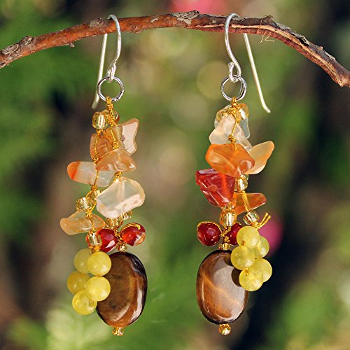 About this item: Nareerat celebrates autumn in Thailand with these colorful earrings. Knotted by hand on silken threads, bright carnelian and yellow quartz crown tiger's eye. The earrings hang from sterling silver hooks. .925 Sterling silver. Hook earrings. 2.4" L x 0.8" W. Tiger's Eye stone heat treated, carnelian stone naturally treated, quartz stone dye treated.