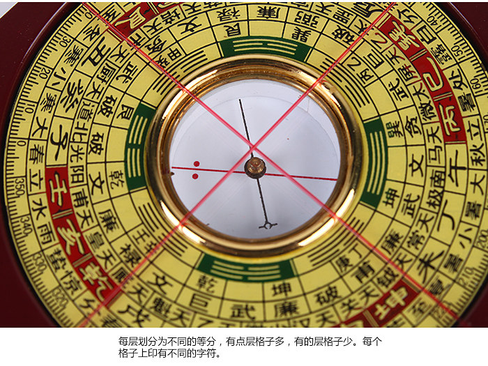 Is close to the compass can be rotated out of the disc . India has many concentric circles on the disk , called a circle layer . Divided into different layers of equal parts , and some multi- layer lattice , less some layer lattice, the least divided into only eight cells, the largest grid has three hundred eighty-four grid layer . Different characters are printed on each lattice . There are many types of compasses , layers and some more, some less , most of the fifty second floor , a minimum of only five .