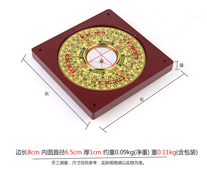 Square outer disk , the disk is in the tray , at the midpoint of each of the outer sides of a hole , penetrate the heart ten days to become red road, used to read the contents of the disk on the tray . Ten Road, Tianxin requirements mutually perpendicular , bought before the new use of the compass must be calibrated in order to use the external disk . Compass is the basic tool for measuring magnetic azimuth of the Earth's surface , is widely used in various fields of military , nautical , surveying , forestry , exploration, construction and so on.