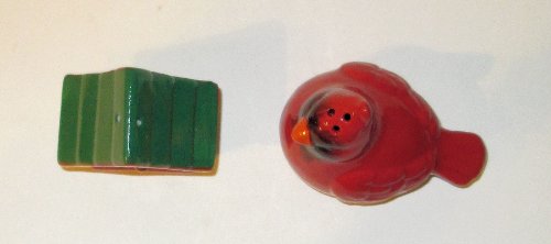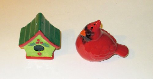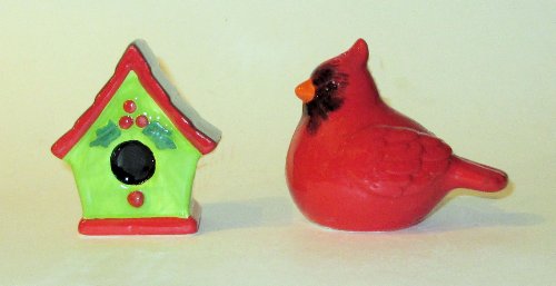 "ABC Products" - (NEW LOWER PRICE) - Ceramic Salt And Pepper Shakers - Shape like Cardinal (Red Bird) - Shaped Like Birdhouse - (Cardinal Red Finish - Birdhouse Green and Red - Accented With Holly)m
