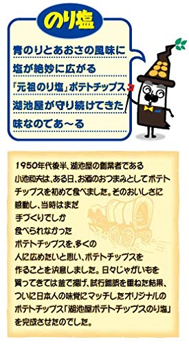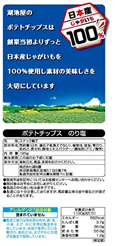 原材料:馬鈴薯(日本:遺伝子組換えでない)、植物油、食塩、青のり、あおさ、香辛料、酵母エキスパウダー/調味料(アミノ酸等)