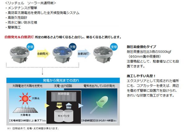 ●<リッチェル ソーラー共通特徴>①メンテナンスが簡単②高効率太陽電池を使用した全天候型発電システム③高耐久性設計④雨水に強い防水仕様⑤簡単施工