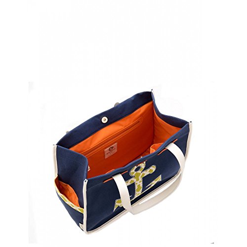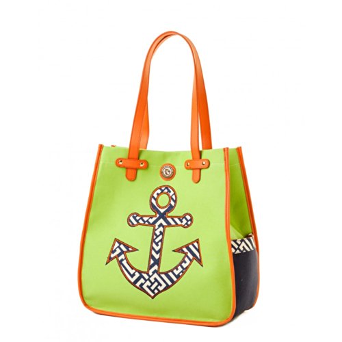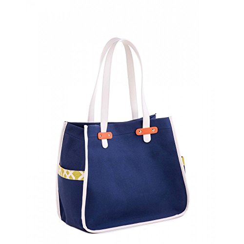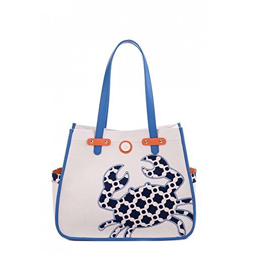 -. Feature : Canvas exterior with signature linen details -Genuine leather accents / Two side linen pockets -Exterior Spartina mermaid medallion / Snap enclosure -Polyester interior lining / Interior zip pocket -Two interior open pockets / Height: 15" -Depth: 6.25" -Width: 14.75"